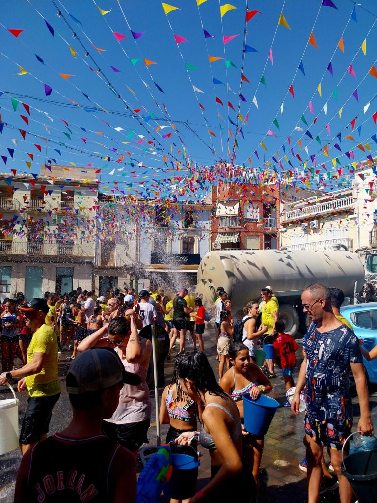 Dan zijner ook nog de geweldige zomerfeesten in Pinoso met de paella gigante, die gratis is en waar je wel even geduld voor moet hebben. Want de rij waar je met je bord of pannetje instaat die is best wel lang. Maar zeker de moeite waard om lekker te genieten tussen de locals. En zolang de pan gevuld kan je daar ook heerlijk een gratis biertje bij drinken, zolang de voorraad strekt. En niet zomaar een biertje gewoon een lekker tappie ijskoud, en of dat nou een pitcher is of een glas dat maakt gewoon helemaal niet uit. Als de paella is verorberd wordt het tijd om langzaam naar de rand van het dorp te lopen met je emmer. Emmer?? hoor ik je denken. Jazeker!! Want dan staat het publiek al te trappelen en te wachten tot de watertruck aan komt rijden en het startsein geeft altijd een beetje onverwacht natuurlijk. Dat is het moment dat de chaos los barst emmer en bakjes worden gevuld uit de waterspuitende truck en het geoorloofd iedereen nat te gooien. Maar dan ook echt IEDEREEN. De truck trekt door de straten en de mensenmassa wordt groter en groter tot deze uiteindelijk op het plein van het gemeentehuis staat. Het watergevecht barst nu echt los en niemand is veilig. Wanneer? Een exacte datum heb ik nog niet, maar denk ergens eerste week augustus. Don’t miss this!!
