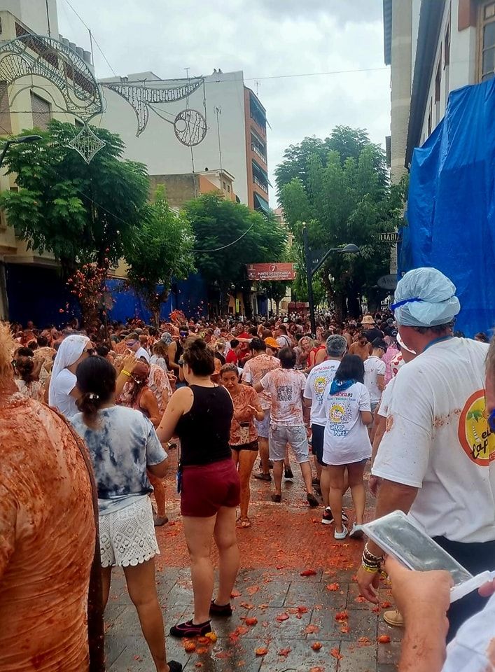 Daar ben ik weer, en dat wordt ook weleens weer tijd zeg! Maar we waren druk. Druk met van alles en nog wat. Want wat dacht je van een bezoek aan Bunol om daar deel te nemen of moet ik zeggen op gepaste afstand toe te kijken naar het festijn bekend onder de naam Tomatina. Bunol ligt op ongeveer 2 uurtjes rijden van ons stekkie, maar de bus werd vanuit Valencia gepakt. Deze stond om 8 uur in de ochtend te wachten om vele gekke mensen samen met ons richting dit dorpje te brengen. Natuurlijk waren eerst de kaarten geboekt, want er is een maximum aan toeschouwers zo´n dag. Ja echt, er mogen maar slechts 20.000 man deelnemen aan dit festijn. Na de aankoop van de kaartjes werden beelden bekeken op You Tube. Daar kwam iedereen er achter dat de volgorde eigelijk verkeerd was 😀 . Maar ach het was te laat, er was geen weg meer terug. Dus de dagen voor dit evenement werden aankopen gedaan. Denk aan witte shirts, korte broeken voor een prikkie (alles kan namelijk zo de vuilnisbak in na afloop), duikbrillen om ogen te beschermen en een waterdicht en smeuri bestendig hoesje voor de telefoon. Het was een drukte van jewelste, en rond 12 uur reden de vrachtwagen gevuld met tomaten voorbij. Het zou beginnen!! Waar in eerste instantie het idee was dat iedereen totaal verkeerd stond, bleek de plek juist ideaal. Vanaf een afstandje net iets hoger dan de rest barste het gevecht los. Tomaten werden over een weer gegooid, de straten liepen vol met tomatenprut, witte shirts (dresscode) werden oranje, haren vol smeuri en uiteindelijk een stank van jewelste door alle rijpe tomaten die opengebarsten door de straten dreven. Het duurt exact een uur, na een uur hoor je het signaal en is het klaar! Straten worden schoongespoten, bewoners komen met tuinslangen naar buiten om een ieder die dat wil zo schoon mogelijk te spuiten. Richting bus was er ook nog de mogelijkheid om te douchen al is dit wat primitief. Schone kleren waren binnen handbereik en in de bus naar Valencia was iedereen weer een ervaring rijker. Nog een keertje? Dit mag je zeker niet uitsluiten. Volgend jaar? Nou dat is misschien iets te snel. We hebben ook nog wel wat andere dingen op onze bucketlist staan die we eerst af gaan werken.
