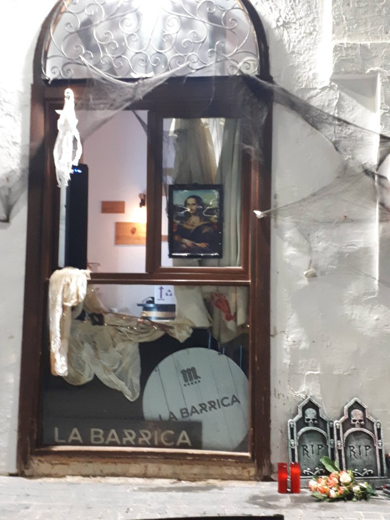 Uiteraard was het ook Halloween in Spanje, iets dat daar groots wordt aangepakt. Zelf zijn wij beide niet van de enge, bloederige horrorachtige taferelen en gaan dat dan ook een beetje uit de weg. Maar in elke winkel, bar en restaurant komt het thema ruimschoots aan bod, dus er was geen ontkomen aan. Spinnenrag, pompoenen, grafstenen, afgehakte bloederige handen en armen je zag het overal. Maar waar wij onze echt uitkeken was toch wel in de Carrefour, waar het personeel dus gewoon met een mes door hun hoofd, en bebloed geschminkt achter de kassa en servicebalie stonden. Het was hilarisch en wij konden ons er geen voorstelling van maken dat dit bij de AH of Jumbo ook zou gebeuren.