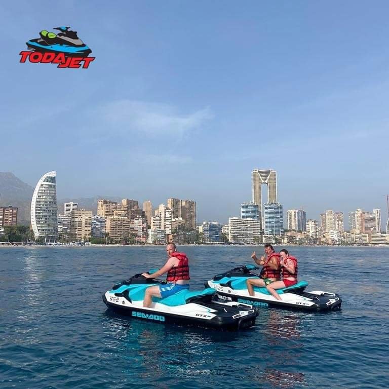 Maar ook aan het strand was het nog heerlijk toeven. Dus tijd om naar een van ons favoriete kustdorpjes te vertrekken. Namelijk Villajoiosa, het vissersdorpje met de boulevard vol met leuk gekleurde huisjes. Normaliter parkeren wij daaraan het eind van de boulevard op het strand, maar deze keer niet. Deze keer kreeg de auto een plekje bij de jachthaven om iets heel speciaals te doen. Tenminste ik heb een heerlijk plekje op het strand gezocht, stoeltje, boekje, zonnebril en watte drinken. Terwijl Dennis zich in zijn zwemvest moest hijsen samen met twee van onze vrienden. Want met elkaar gingen zij namelijk de kust onveilig maken samen met een gids op ieder op een waterscooter. Een tocht van een uur, waar je vanuit Villajoiosa richting Benidorm gaat en het eilandje voor Benidorm aandoet. Tussendoor uiteraard even een stop om lekker te plonzen vanaf de jetski, en te genieten van het Las Vegas aan de Costa Blanca vanaf zee. Je zou denken een uur op zo’n ding is best lang, maar het zal je verbazen hoe snel dat eigenlijk voorbij gaat. Enthousiast en tijd om even uit te puffen en bij te komen van alle indrukken, werden de stoeltjes om mij heen ook bezet. De verhuurder van het bedrijf stuurde ondertussen ook nog wat foto’s en filmpjes door van deze ervaring. Zowel Dennis als onze vrienden waren het er over eens dat het een super toffe ervaring was, al was het niet de goedkoopste.
