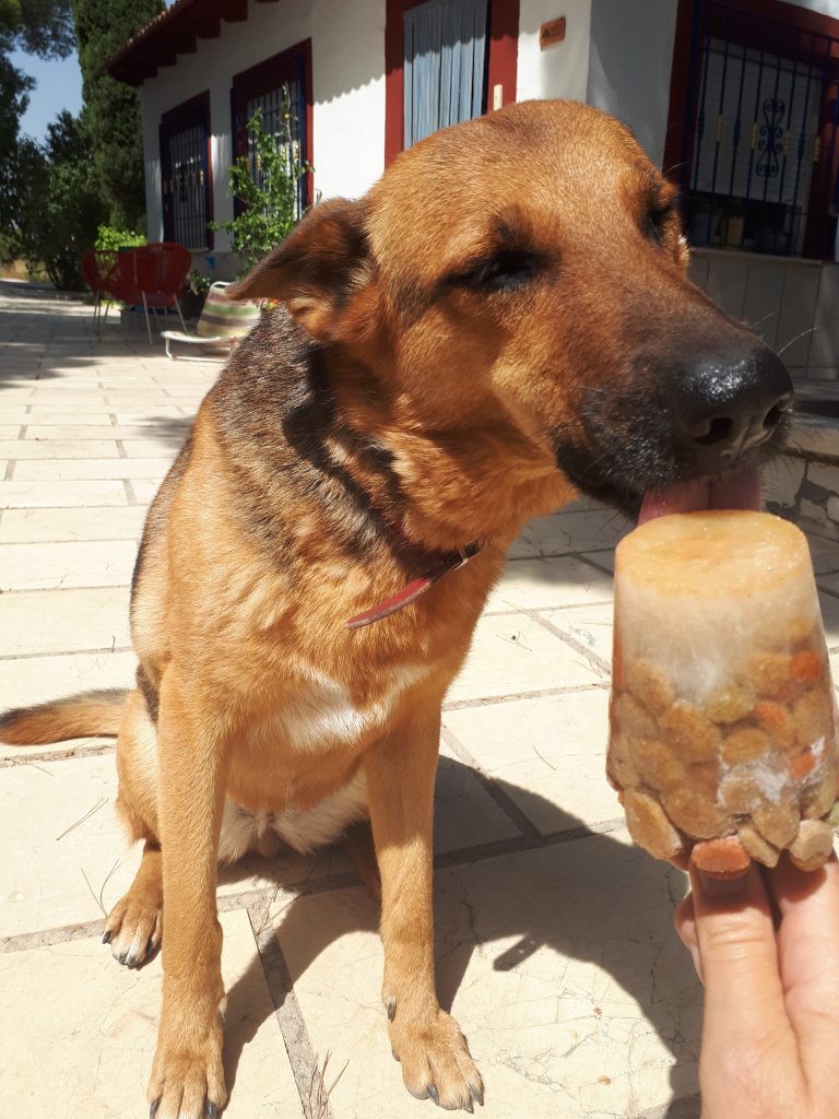 Zoals het er nu uitziet was al die spanning voor niets en is het hele gebeuren met een sisser af gelopen. De bult is nog steeds aanwezig in de hals, wordt niet kleiner maar ook niet groter. De mascotte van El Capricho lijkt er zef weinig last van te hebben. Is vrolijk, is lui, is waaks, speelt ’s avonds als de hitte minder wordt graag met haar bal, nog steeds gek op wandelingen en de konijnen die we tijdens die wandelingen tegen komen. Eet goed drinkt goed snoepjes gaan er goed in net als heerlijke verkoelende hondenijsjes! Dus hopelijk hebben de 3 weken antibiotica ook haar werk gedaan voorafgaand aan de trip naar Valencia waar onderzoek heeft plaats gevonden en een operatie dus niet nodig bleek. Uiteraard houd ik haar goed in de gaten en wachten we de resultaten af die we nog zouden moeten krijgen van de dierenarts.