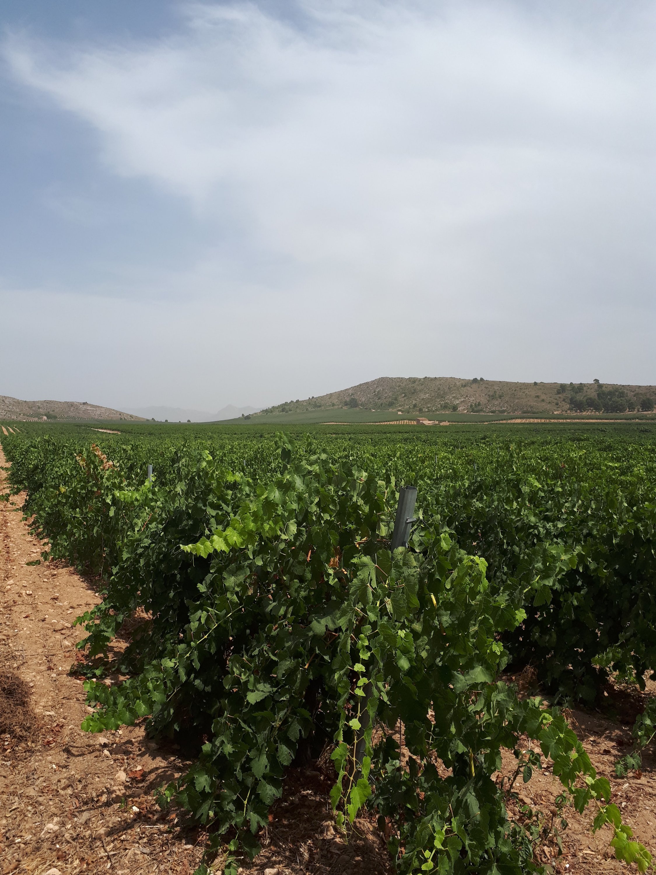 Wat meer afgelegen, je zit dan ook zo´n klein half uurtje in de auto vanaf El Capricho Sax. Vind je de bodega van Francisco Gomez. Werkelijk een lust voor het oog, wat een omgeving is dit! De weg er naar toe is al prachtig, je bent alleen maar omringd door bergen en boomgaarden met olijven, amandelen en kersen. En dan het laatste stukje tot het toegangshek en de oprit naar de bodega, zo prachtig. Oleanders in volle bloei en prachtige rozen en alleen maar velden vol met druiven zover als je kan kijken en een serene rust. Zo het tegenovergestelde als je deze plek vergelijkt met Las Virtudes, maar zo waanzinnig mooi. Dat je alleen maar druiven ziet is ook niet raar met een oppervlakte van 3.500 hectare.