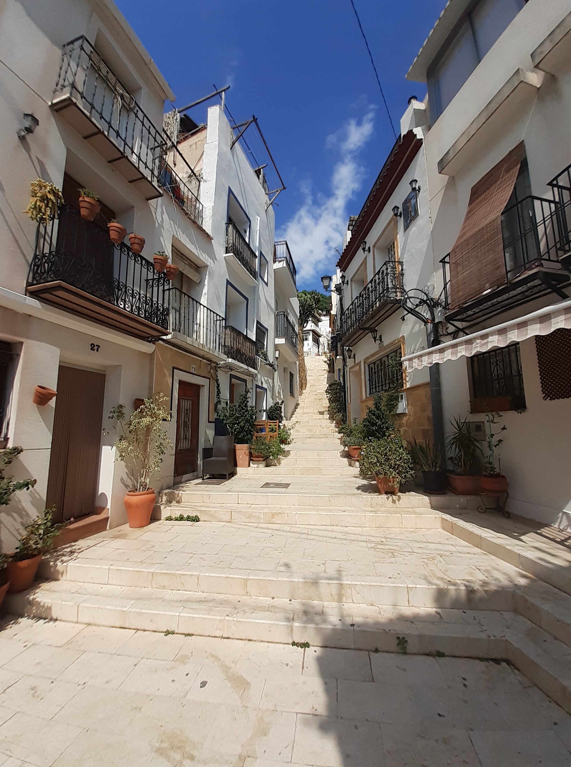 Uiteraard hebben wat winkels aangedaan en lekker geluncht, om daarna aan de klim te beginnen. Stapje voor stapje, trapje voor trapje zijn we door Barrio Santa Cruz gewandeld. Het oudste deel van Alicante waar geen auto’s meer rijden, de stoeltjes voor de deuren staan, en straatjes gevuld zijn met potten vol met planten. En wat misschien wel het meest bijzondere is, is dat het er zo stil is terwijl je midden in de stad bent. Het was een hele klim, zeker in deze hitte en met mondmasker op. Daarom hebben we weer even een pitstop gemaakt bij een te leuk restaurantje, om daarna onze weg weer verder te volgen.