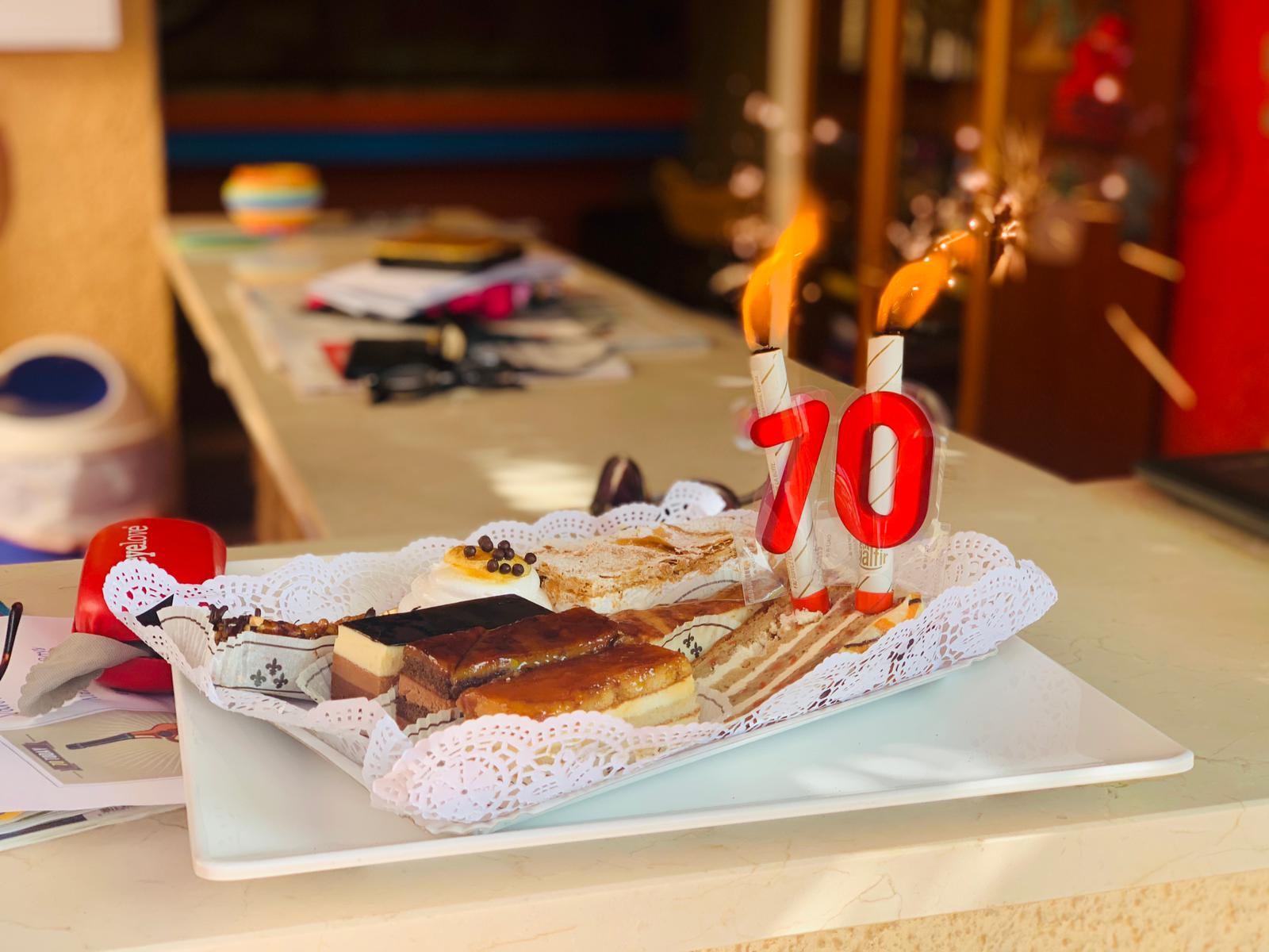 Totaal onverwacht kregen wij ook nog bezoek van Ad. Nou ja niet helemaal onverwacht, want eigenlijk stond dit al in de planning maar code oranje gooide roet in het eten. Nadat nieuwe plannen werden gemaakt, die ook niet door konden gaan werd het toch plan A. En zo gebeurde het dat Ad ons toch een bezoekje bracht om tijdens zijn verblijf zijn 70ste verjaardag te vieren. En dat was zeker geen slechte keuze. Want wat een heerlijke tijd hebben wij met elkaar gehad, en wat is Ad in het zonnetje gezet. Slingers, versierde rollator (die nog even een paar jaar de kast in moet), gebak, cadeaus en een beregezellig etentje later die dag. Want op verzoek van Ad ging Vicente dus speciaal voor ons open. Zodat wij konden genieten van een tafel vol hapjes (denk aan ham, calamares, garnalen pan con aioli, queso frito) waarna de hete steen met flinterdunne stukjes biefstuk op tafel kwam, gevolgd door een heerlijk dessert. Uiteraard mocht het bier en de wijn niet ontbreken en was het een avond die de boeken in kan als zeer geslaagd.